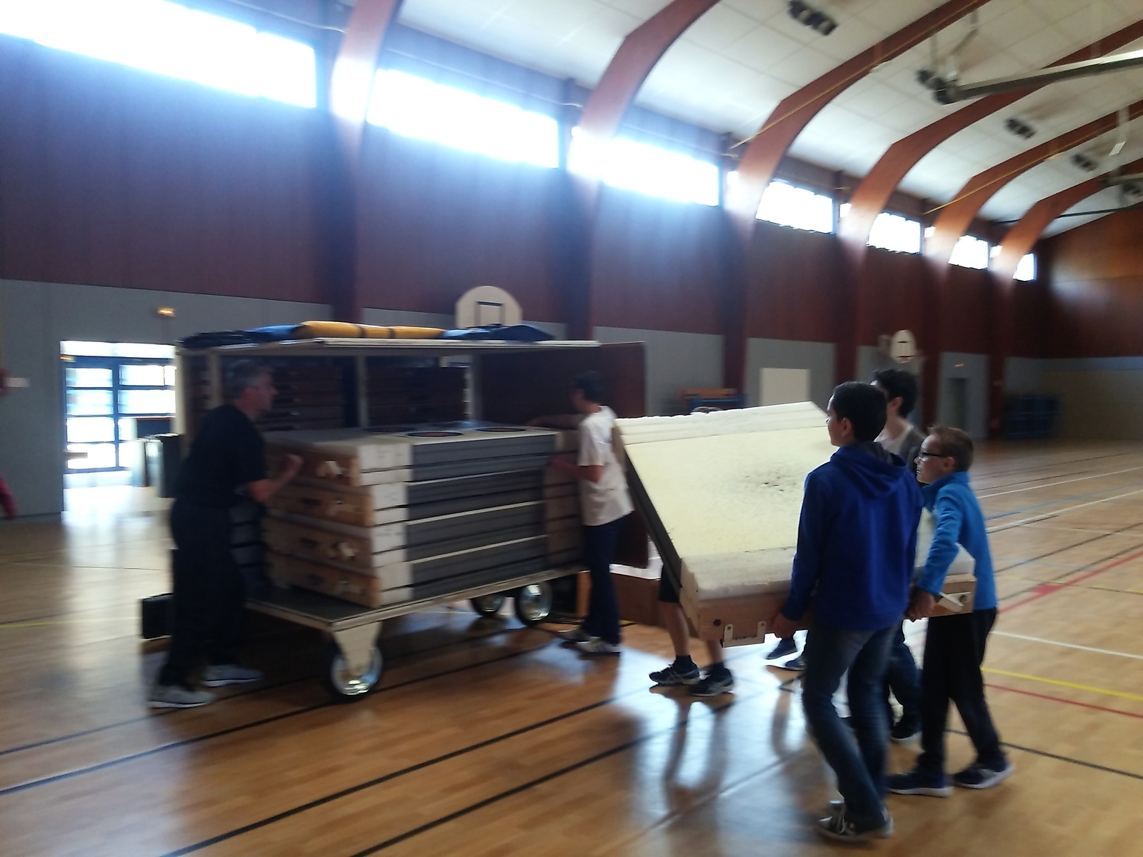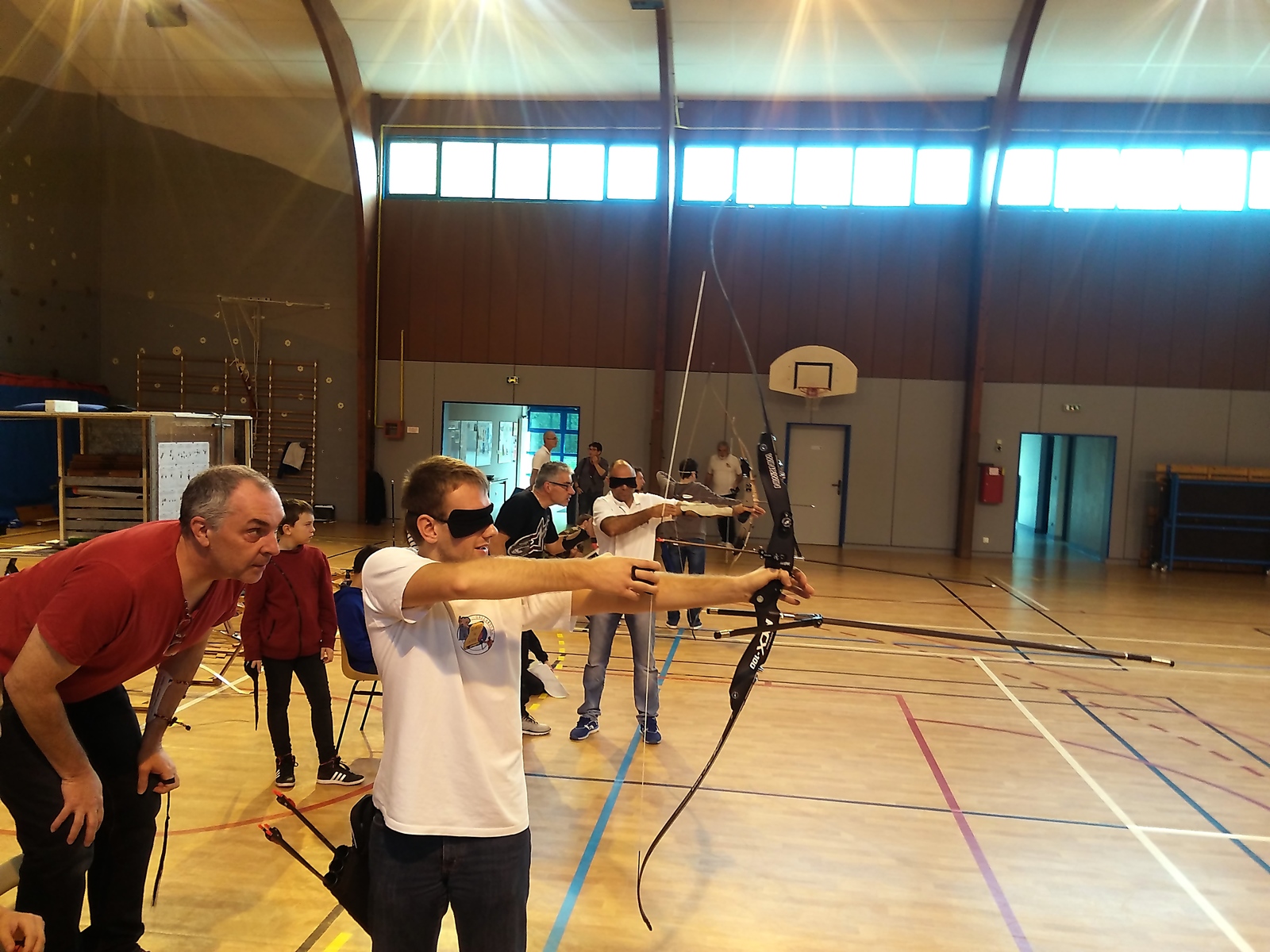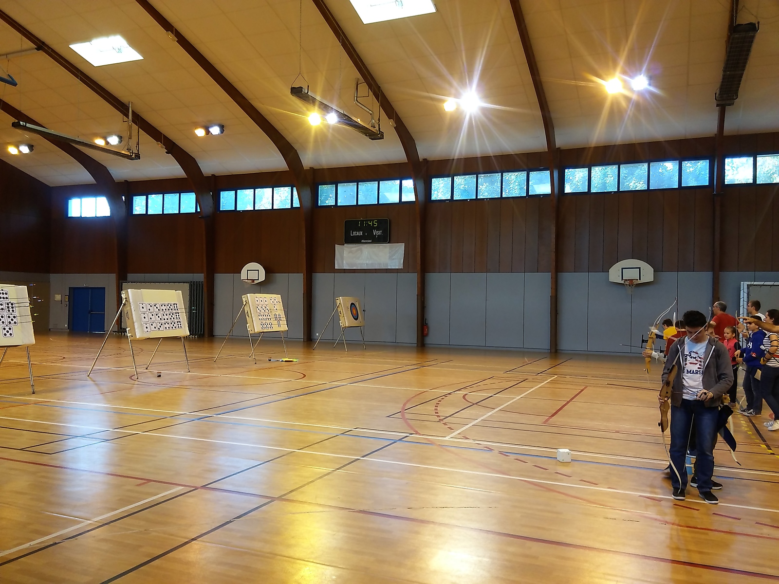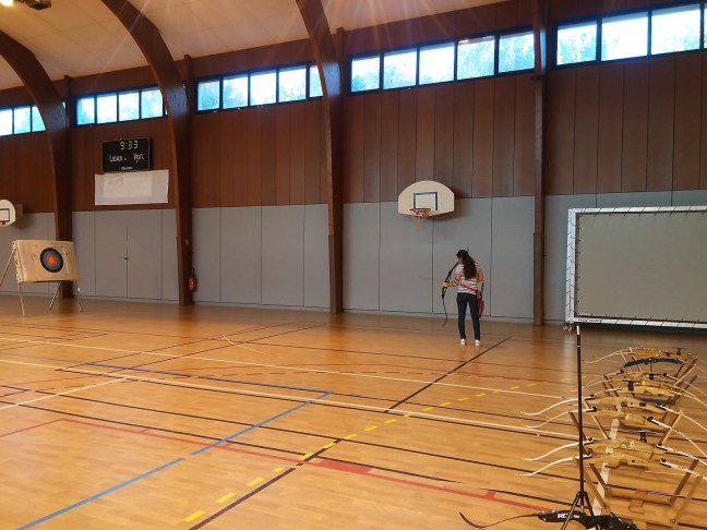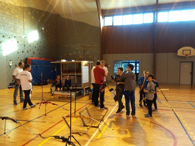 Tout d’abord, au gymnase, petites épreuves pour s’amuser. Après un échauffement général à 10m sans viseur, nous avons attendu notre dernière arrivée pour nous mettre par équipes.